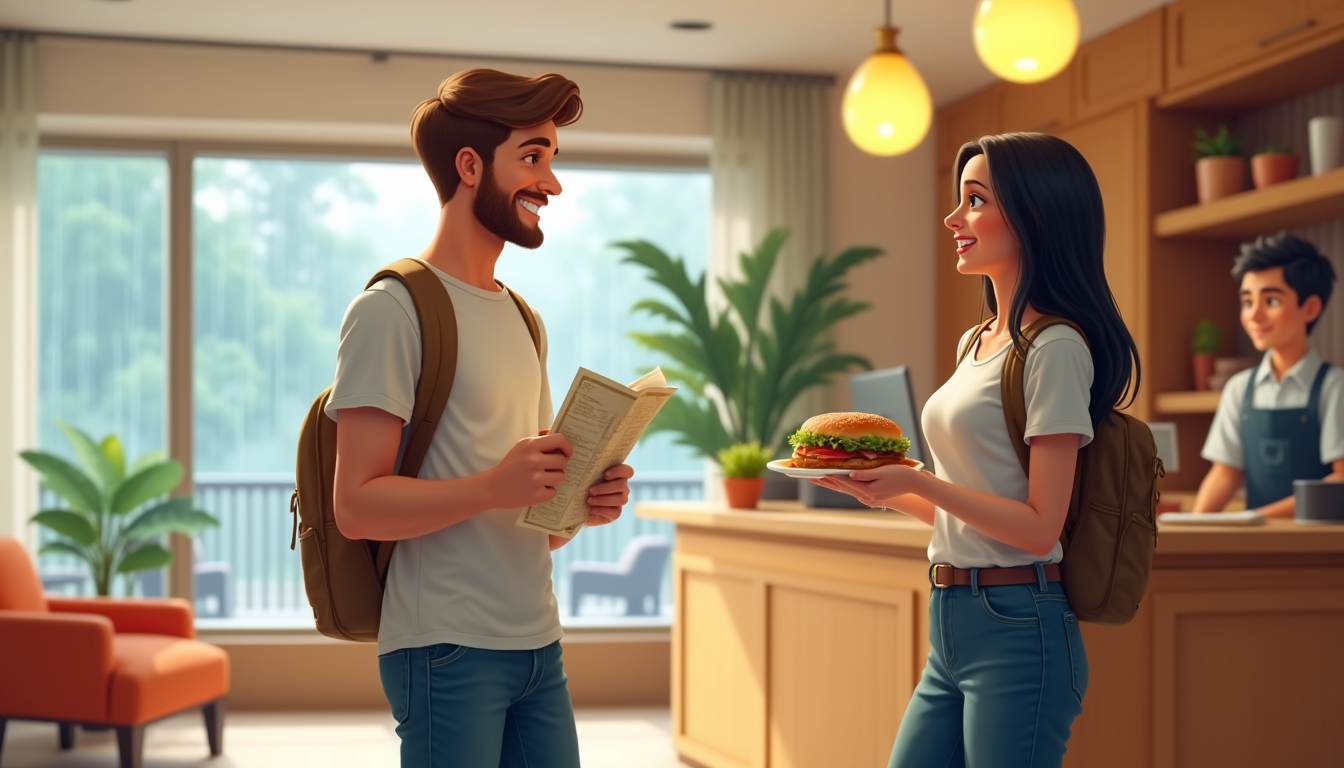 John was a cheerful traveler who loved exploring new places. One bright morning, he arrived at the Sunny Days Hotel with a suitcase in one hand and a map in the other. As he stepped into the lobby, he saw a friendly face at the reception desk.